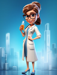 Photo cartoon woman doctor character with big syringe and glass bottle with clear blue liquid, health and medical stock image