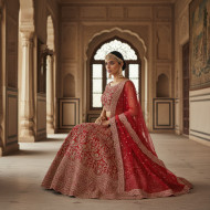 Brocade lehenga bridal fashion kneeling in royal hall google gemini prompt