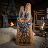Nordic folk jewelry in rustic wooden cabin with carved pinewood google gemini prompt