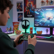 gaming controller teenage gamer bedroom video game playful lifestyle youth culture home entertainment handheld control casual gaming leisure activity colorful interior posters snacks headphones led lights action figures fun mood technology modern youth prompt google gemini nano bananaImagine Buddy