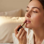 young woman applying lipstick nude lipstick lip care fair skin cozy bedroom linen textures daylight beauty lighting shallow depth of field lifestyle skincare commercial aesthetic premium beauty self care soft lighting natural skin makeup application daily routine intimate setting prompt google gemini nano bananaImagine Buddy