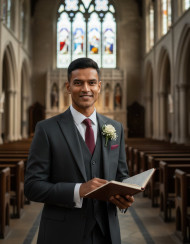 groom wedding groom wedding portrait three piece suit vow booklet historic church elegant groom formal menswear romantic wedding cinematic lighting stone interior marriage vows groom preparation timeless style commitment concept refined fashion solemn ceremony classic elegance prompt google gemini nano bananaImagine Buddy
