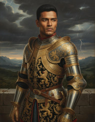 knight gilded armor castle battlement high renaissance oil painting museum quality stormy sky candlelight fine craquelure medieval warrior historical portrait armor detail heroic pose dramatic lighting battlefield mood classical art renaissance style epic scene knightly figure noble armor prompt google gemini nano bananaImagine Buddy