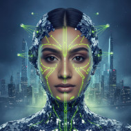 nano futurism woman futuristic portrait advanced nanotech cybernetic face micro technology smart city sci fi character female cyborg future metropolis self assembling tech digital evolution luminous skin green blue lighting volumetric fog high tech future urban innovation transhumanism prompt google gemini nano bananaImagine Buddy