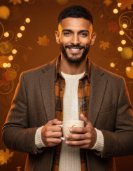 mature man celebrating thanksgiving holding coffee mug autumn layers bold lighting instagram vertical modern lifestyle high contrast maple brown amber festive mood cozy atmosphere ultra sharp dynamic composition social media ready harvest season warm scene autumn fashion prompt google gemini nano bananaImagine Buddy
