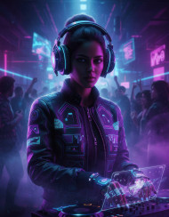 female virtual dj cyberpunk cybernetic headphones glowing jacket led finger controllers neon glow nightclub cinematic volumetric fog hyper detailed futuristic neon lights music holographic nightlife electronic dance party scene dj equipment sci fi techno prompt google gemini nano bananaImagine Buddy