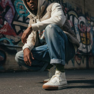 high top sneakers sustainable footwear recycled rubber shoes streetwear fashion urban style influencer pose casual crouch graffiti wall moody lighting eco fashion layered socks ethical style youth culture city fashion modern sneakers lifestyle portrait footwear detail fashion editorial environmental concept product branding prompt google gemini nano bananaImagine Buddy