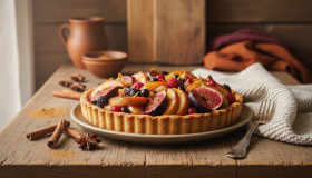 fruit tart dessert tart autumn dessert cozy kitchen seasonal baking warm tones cinnamon sticks vintage table three quarter angle pastry dessert sweet treat fall colors knitted napkin homemade pastry rustic table bakery item comfort food window light festive dessert editorial presentation harvest season prompt google gemini nano bananaImagine Buddy