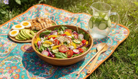 summer salad salad bowl picnic flat lay healthy food vegetarian meal fresh vegetables outdoor dining colorful food garden scene picnic blanket bamboo cutlery sliced vegetables patterned cloth bright sunlight rainbow palette clean eating plant based seasonal produce food styling top view composition natural light summer recipe editorial presentation vibrant colors prompt google gemini nano bananaImagine Buddy