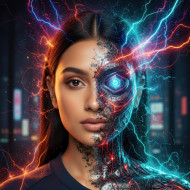 Mixed media sci fi portrait with electromagnetic field skin fusion google gemini prompt futuristic portrait