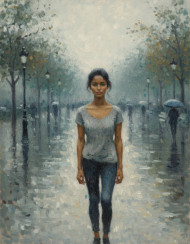 person urban park rain standing wet reflections impressionist painting monet style stippled brushstrokes muted colors textured canvas slate gray soft ochre muted teal rainy city reflective puddles moody atmosphere overcast light city nature soft focus tranquil scene prompt google gemini nano bananaImagine Buddy