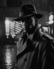 film noir portrait person rainy city trench coat fedora silk dress dramatic shadows side-lighting 35mm black and white moody vintage cinematic noir lighting high contrast heavy grain night urban dimly lit mysterious prompt google gemini nano bananaImagine Buddy
