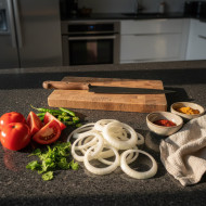 raw vegetables onion rings tomato wedges coriander leaves green chili food preparation healthy cooking ingredient layout fresh produce meal prep granite countertop cutting knife spice bowls tea towel afternoon light modern kitchen instructional setup raw ingredient kitchen prep cooking concept prompt google gemini nano bananaImagine Buddy