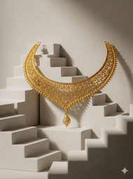 gold necklace minimalist jewelry product display gold pendant architectural staircase luxury accessory neutral background modern design shadow play fine jewelry clean composition geometric style studio lighting contemporary aesthetic metallic shine elegant simplicity premium product artistic shadows structured design macro detail refined look prompt google gemini nano bananaImagine Buddy