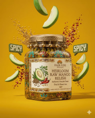Mango pickle jar with floating mango slices bold modern ad google gemini prompt
