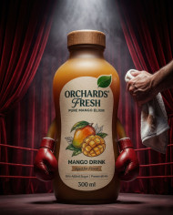 Mango drink bottle as boxing champion in dramatic ring scene google gemini prompt