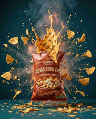 Explosive queso chips burst with spinning corn chips action google gemini prompt