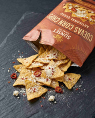 tortilla chips queso chips spilling chips snack bag rustic surface food styling corn chips cheese dust casual snack minimal kitchen natural look broken package crunchy texture close up authentic feel snack moment simple composition food detail earthy tones prompt google gemini nano bananaImagine Buddy