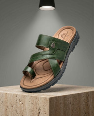 sandal leather sandal forest green sandal gallery display minimal background product showcase footwear design spotlight lighting luxury concept modern art style premium sandal clean composition neutral tones texture focus studio setup elegant design branding concept high contrast retail display commercial ad prompt google gemini nano bananaImagine Buddy
