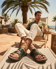 sandal leather sandal forest green sandal man wearing sandal lifestyle footwear casual fashion relaxed mood summer style toe ring sandal comfortable fit premium footwear holiday vibe linen chair fashion editorial natural light shadow pattern modern lifestyle men fashion footwear detail product showcase outdoor living prompt google gemini nano bananaImagine Buddy