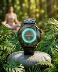Wellness smartwatch on stone with nature and meditation concept google gemini prompt