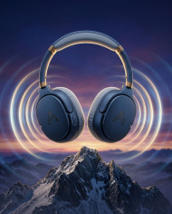 wireless headset over ear headphones floating object sound waves mountain peak sunset sky audio technology conceptual design premium tech centered composition surreal concept glowing effect peaceful mood zen style wide angle atmospheric innovation immersive audio futuristic scenic landscape product showcase prompt google gemini nano bananaImagine Buddy