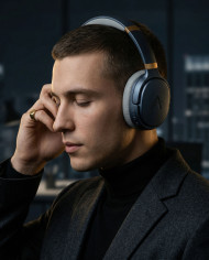 wireless headset over ear headphones fashion portrait young man closed eyes cinematic lighting luxury tech audio device urban background premium style noir aesthetic rim lighting high contrast stylish model headband shallow depth bokeh editorial style modern lifestyle sound experience matte finish gold detail soft cushion tech accessory prompt google gemini nano bananaImagine Buddy