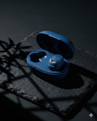 wireless earbuds charging case luxury product black slate dramatic lighting premium design top view audio device modern technology matte finish shadow play minimal composition dark background elegance high contrast product showcase sleek design refined style studio lighting luxury concept prompt google gemini nano bananaImagine Buddy