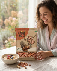 peanut pouch breakfast scene morning light healthy snack oatmeal bowl lifestyle setting raw peanuts dining table woman smiling natural tones fresh start home interior prompt google gemini nano bananaImagine Buddy