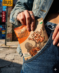 peanut pouch streetwear fashion denim pocket urban style product lifestyle close up hand detail modern snack city background trendy look casual vibe fashion accessory prompt google gemini nano bananaImagine Buddy
