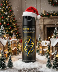 Insect spray can in snowy village with festive holiday lights google gemini prompt
