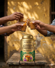 Tea tin with chai glasses and friends social moment google gemini prompt
