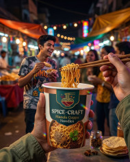 instant noodles street food night market noodle cup chopsticks lifestyle neon lights social eating quick snack urban scene youth culture bokeh prompt google gemini nano bananaImagine Buddy