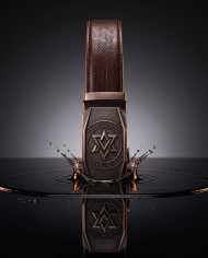 Leather belt with reflection on dark liquid surface studio google gemini prompt