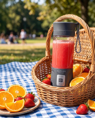 blender picnic scene watermelon juice outdoor lifestyle summer food fresh fruit healthy drink kitchen appliance bright sunlight park setting leisure activity vibrant colors prompt google gemini nano bananaImagine Buddy