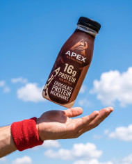 Floating protein bottle above hand against blue sky google gemini prompt