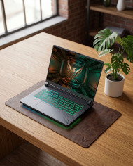 gaming laptop workspace setup wooden desk modern loft home office minimal design indoor plant clean layout productivity concept natural light organized desk calm atmosphere prompt google gemini nano bananaImagine Buddy