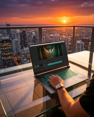 gaming laptop balcony view sunset skyline content creator lifestyle work typing hand modern workspace city background golden hour light remote work creative professional luxury lifestyle prompt google gemini nano bananaImagine Buddy