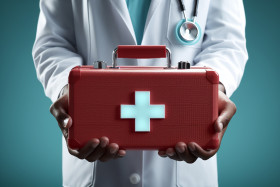 Doctor gives first aid medical kit model to a patient, health and medical stock image