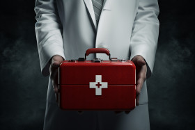 Doctor with a red first aid kit in his hand, health and medical stock image