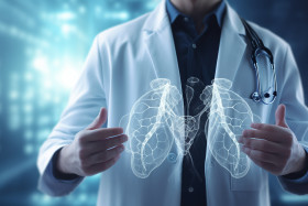 The doctor wearing a white coat holds hand displaying an image of the lung in the foreground of the screen, health and medical stock image