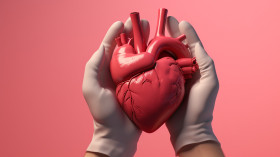 Human model of heart being held by medical student in pink glove, human heart image