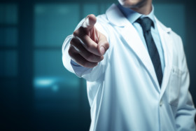 Doctor pointing to a blue hand pointing stock photo, health and medical stock image