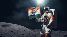 An astronaut holding an indian flag on the moon, chandrayaan with indian flag