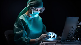 Female surgeon in mask and gloves standing on her laptop, medical images stock