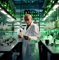 A long shot of a scientist in a white coat standing in a laboratory, medical images stock