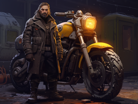 A man with a motorcycle stands next to a dieselpunk motorcycle