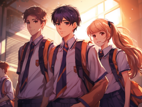Three anime boys and a girl wearing school uniforms