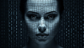 Black and blue digital image of a woman using artificial intelligence, ascii style art
