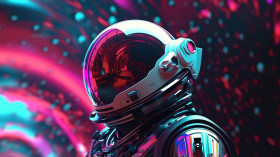 A spaceman wearing a helmet stands against a colorful background, synthwave style art